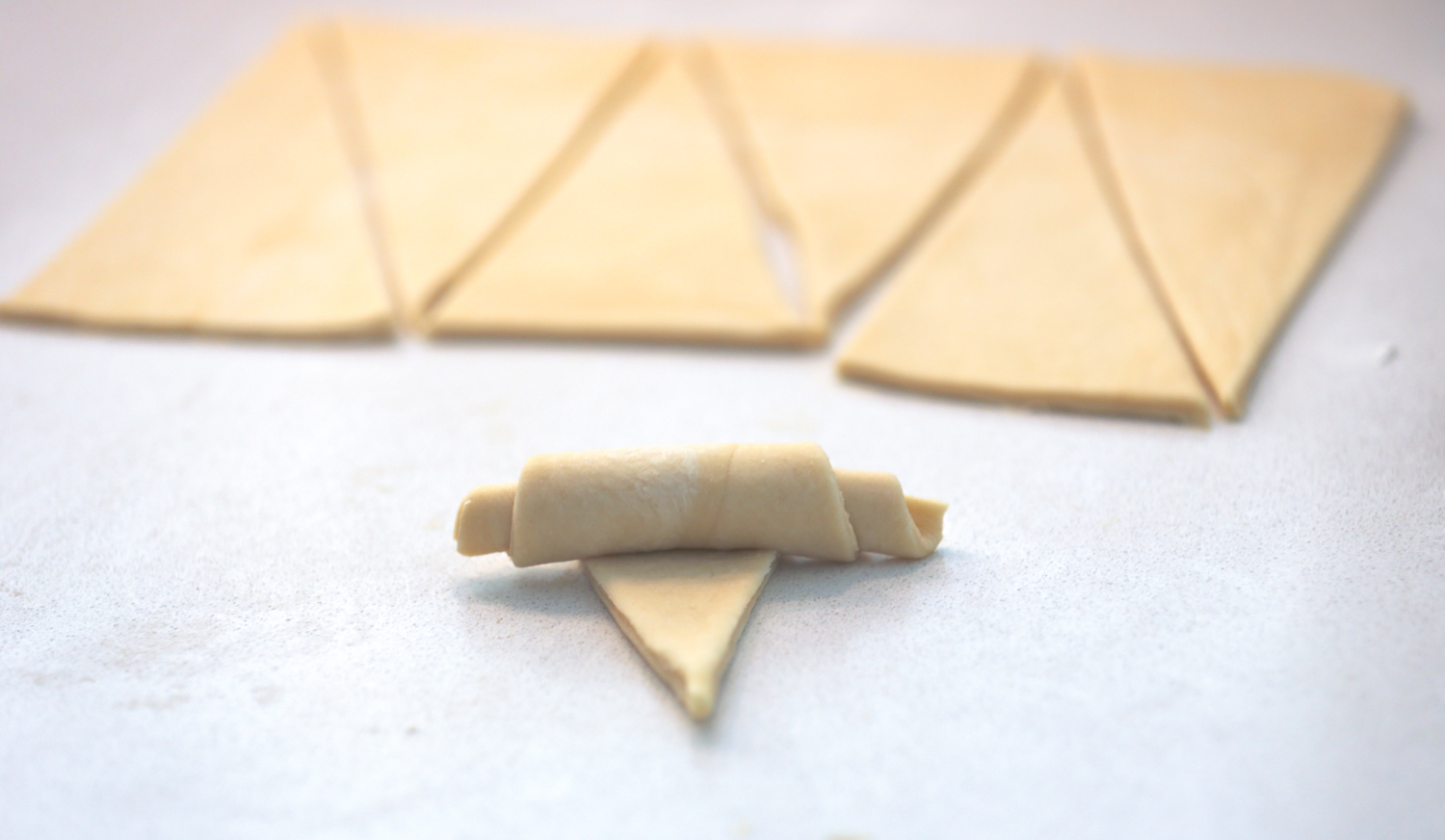 Farinez le plan de travail et étalez la pâte. Coupez des rectangles et roulez ces derniers pour former des croissants.