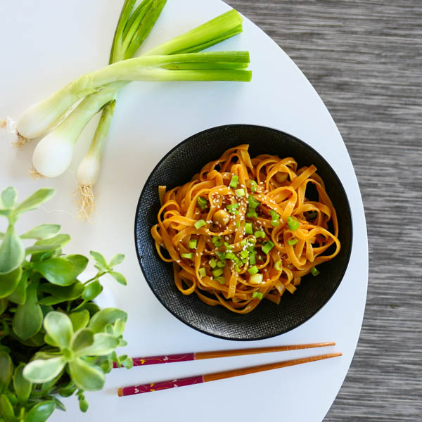 Vous pouvez ensuite servir dans des assiettes creuses, et utiliser les tiges des oignons nouveaux ainsi que quelques graines de sésame pour la déco.