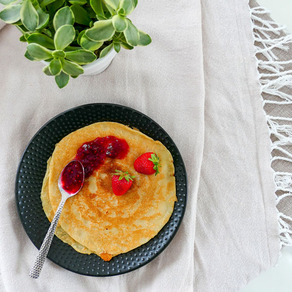 - Faites chauffer une poêle à crêpes avec un peu d’huile de coco, ajoutez la pâte et retournez la crêpe au bout de 2 minutes. Laissez-le encore 1 petite minute… et c’est prêt !
