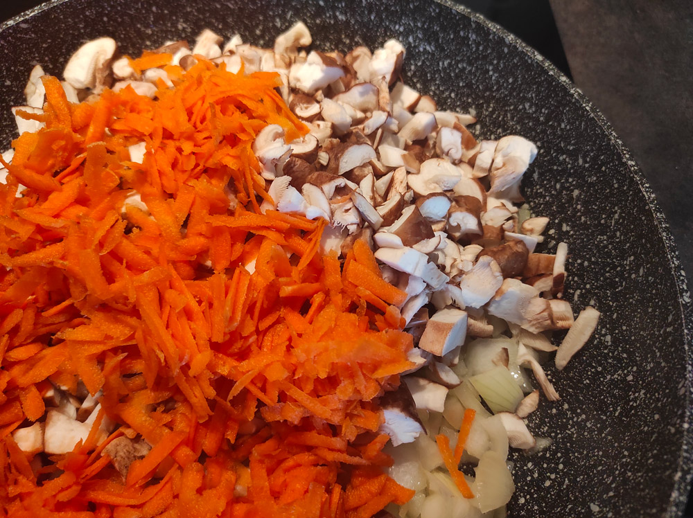 - Emincez et hachez les shiitake, râpez grossièrement les carottes et ajoutez-les aux oignons pour la cuisson.