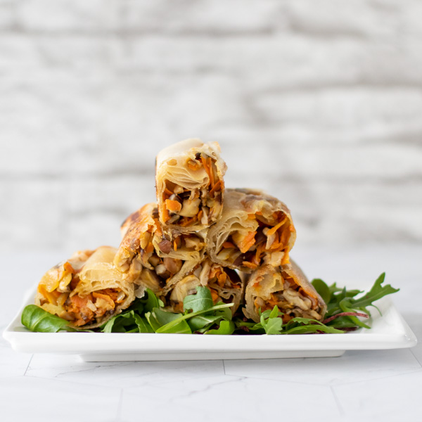 Après quelques recherches, je suis finalement arrivée sur une création, avec des produits faciles à trouver : des feuilles de brick, des champignons, des carottes, et quelques épices.